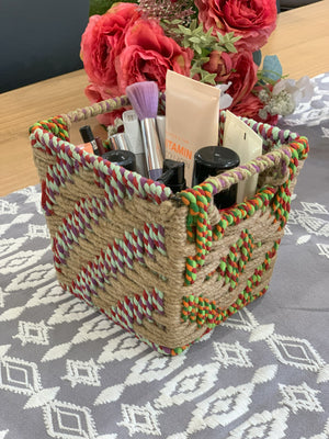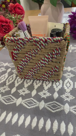 This functional yet fantastic storage basket is an iron and thread offering and has been handwoven by rural artisans employing the art of basketry. Being a handmade process used by local artisans of the weaving community, the craft of basketry is quite interesting to witness. The whole offering is exclusively just woven strips of braided thread which get beautifully decorated by applying various themes and ideas. These products are what then become your daily bags, baskets, and other accessories