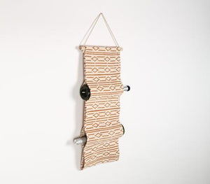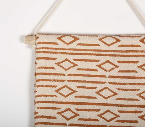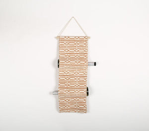 Here is a wine rack with a difference! This reinvented classic is crafted from pure cotton and touts an iconic rusty orange hand block printed design. Set on a sturdy wooden dowel, it can comfortably accommodate five wine bottles. A minimalistic, space-saving design makes it a must-have for any home bar! The art of hand block printing has been passed down various generations within families and communities in India. The making process starts with the block design that is first drawn on paper and then carved by hand onto wooden blocks with an approximate thickness of 18-24 centimeters. The block is dipped in dyes and carefully stamped on the cotton fabric by an artisan. Each pattern is stamped individually onto the fabric. The process is repeated multiple times by skilled hands and a steady movement. Block carving in itself is a precise art requiring years of apprenticeship because it is done by hand. The subtle gaps and overlaps are a beautiful reminder of the charm and exclusivity of such handmade crafts. This wine rack can double up as a wall hanging and is an ideal pick for both contemporary and quirky spaces