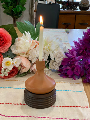 Crafted with care and full of character, thiscandle holder blends natural terracotta with a ribbed wooden base to create a warm, grounded accent for your home. Molded and baked at high temperatures by North Indian artisans, it celebrates traditional pottery with a modern twist.