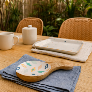 Each platter is shaped and painted by hand using traditionalenameling techniques passed down through generations of artisans in North India. The enamel adds a splash ofcolor while protecting the wood, making it easy to clean and long-lasting. The geometric pattern gives it a modern edge, while the natural wood grain keeps it grounded and warm.