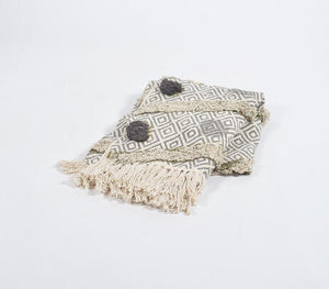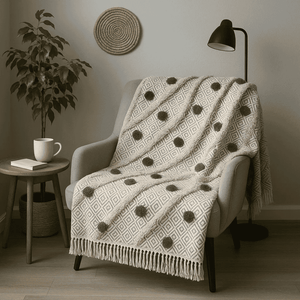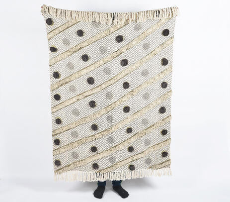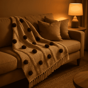 A cotton throw that wraps your space in softness and joy. Add warmth, texture, and playful charm to your home with ourPom Pom Cotton Throw Blanket—a handcrafted piece woven from natural cotton and finished with oversized tassels that dance with movement. Designed for cozy corners, layered beds, or styled sofas, this throw brings a touch of whimsy to your everyday rituals.
