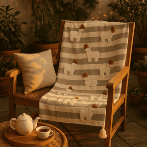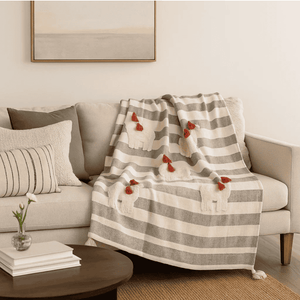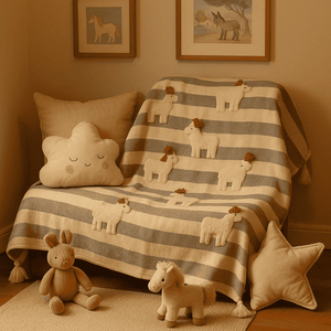 A cotton throw that blends whimsy with craftsmanship. Add playful elegance to your space with ourStriped & EmbroideredTasseled Ponies Cotton Throw—a handcrafted textilethat’s as cozy as it is characterful. Tailored with love from soft, breathable cotton, this throw features embroidered pony motifs, contrasted thread tassels, and a rhythmic striped pattern that brings movement and charm to any room.