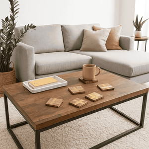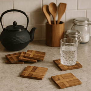 Wooden coasters that bring warmth, craft, and character to your table. Protect your surfaces in style with ourDark Burnt Wooden Coasters, a set of four handcrafted pieces finished with a rich, dark burn that highlights the natural grain of the wood. Each coaster is shaped and detailed by Indian artisans using traditional hand tools and simple lathes, making every set unique.