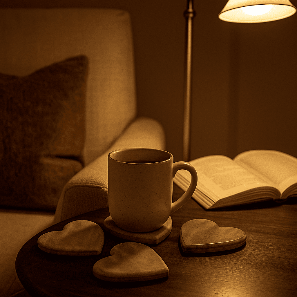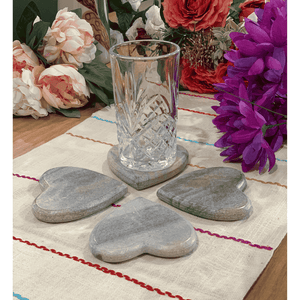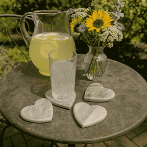 Add a touch of romance and refinement to your table with this set of hand cut marble coasters — shaped into soft hearts and polished to perfection. Crafted by skilled stone artisans using simple tools and timeless techniques, each marble coaster is a one-of-a-kind piece that blends natural beauty with everyday function.