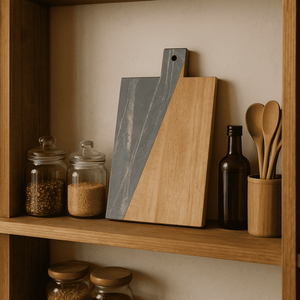 • Design: Flat rectangular board with raw wood and smooth marble contrast