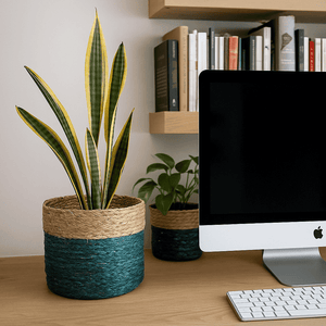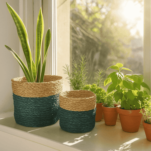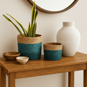 Bring Nature IndoorsThesehandwoven planters are made from sabai grass—a strong, natural fiber found in Odisha, India. Each piece is crafted by hand using simple tools and age-old techniques. The result? A set of two eco-friendly planters that feel earthy, warm, and full of soul.