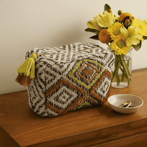 Tailored with love and stitched with soul, thiscotton travel pouch is handcrafted from 100% cotton and quilted with a playful diamond pattern. Designed by North Indian artisans, it blends boho charm with everyday practicality — perfect for storing makeup, coins, tech bits, or travel essentials.