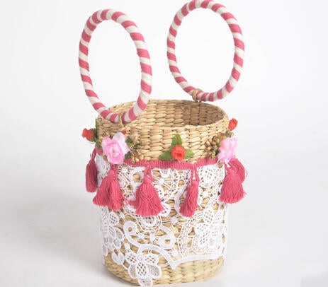 Floral Lace Tasseled Woven Bucket Bag – Handcrafted Cane Elegance