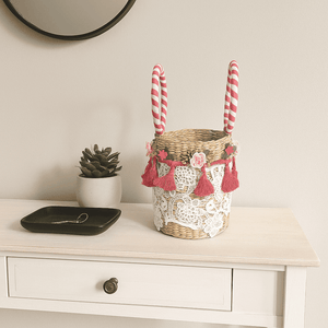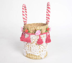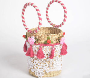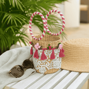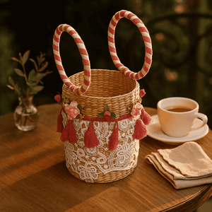 A woven bucket bag that blends tradition with whimsy. Step out in style with ourFloral Lace Tasseled Woven Bucket Bag—a handcrafted piece that celebrates texture, craftsmanship, and playful charm. Made from natural cane using traditional basket-weaving techniques, thisbucket bag is lightweight, breathable, and full of character.