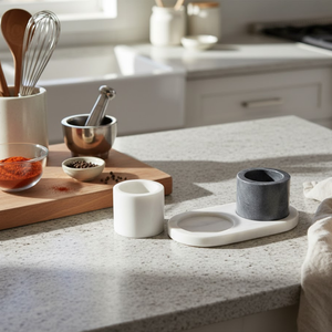 Elevate your dining experience with thisturned contrast marble condiment set, akitchen must-have that blendstraditional craftsmanship with contemporary design. Each piece ishand-sculpted from polished marble by skilled artisans using thestone-turning technique, a craft that dates back centuries.