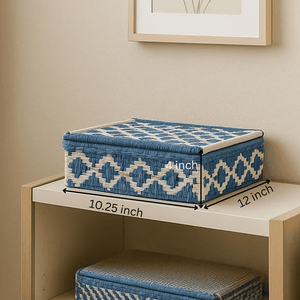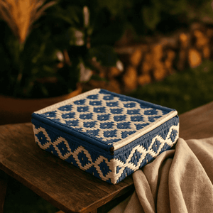 Tidy up in style with thisrecycled cotton beige & blue storage box — a handcrafted piece that blends function with beauty. Designed with a modern geometric weave in soft beige and calming blue, thiscotton storage box is perfect for keeping your space organised while adding a touch of artisanal charm.