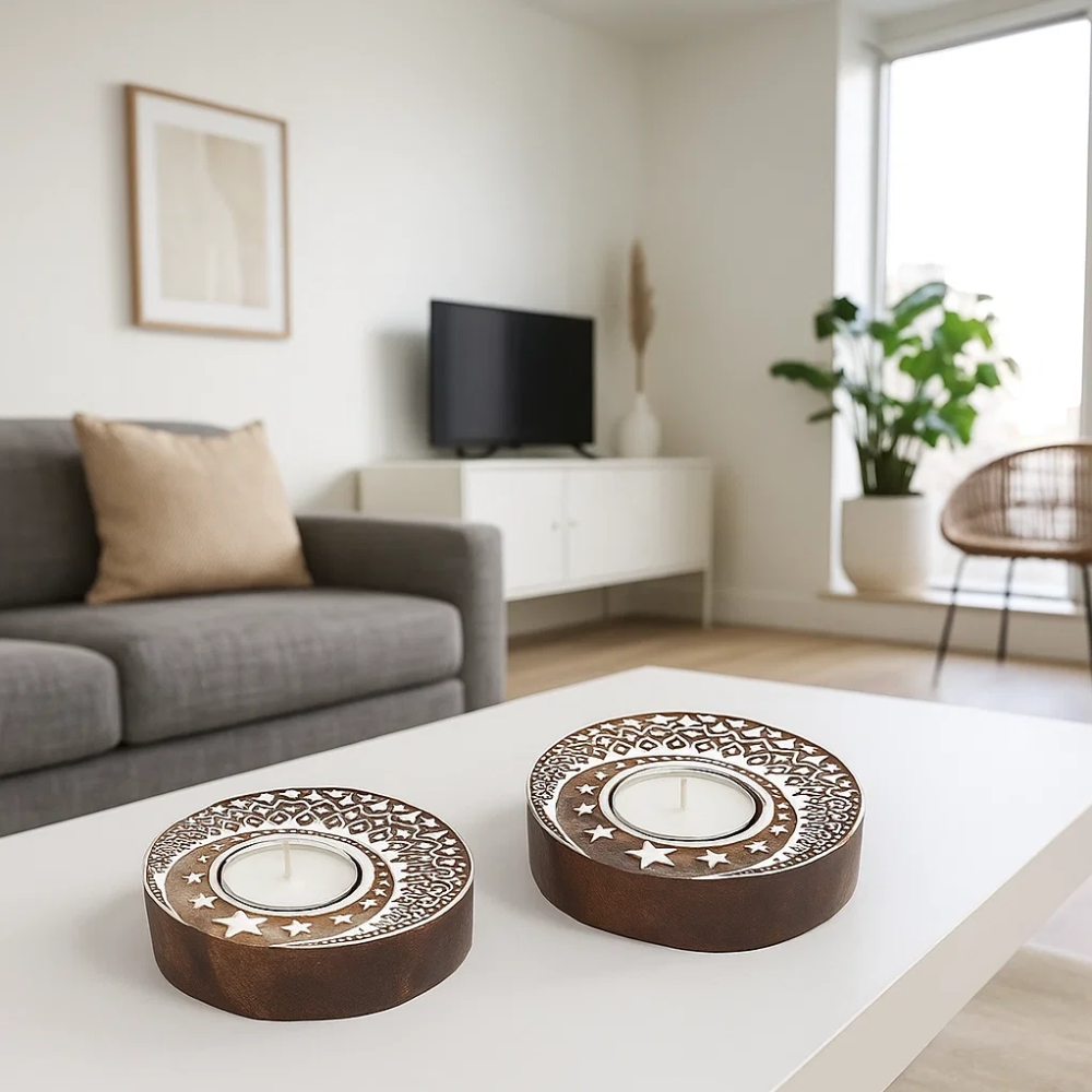 Designed to hold tealights, these holders create awarm, ambient glow, perfect forfestive occasions, meditation spaces, or cozy evenings at home. Becausethey’re handmade,slight variations in carving, polish, and finish are natural, ensuring every set is unique.