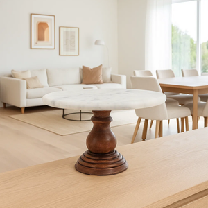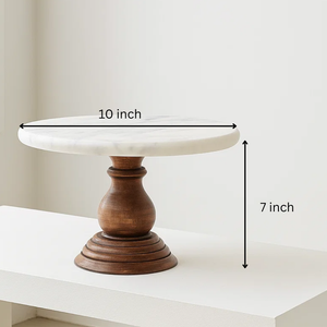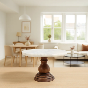 Thesmooth white marble top provides adurable, elegant surface for cakes, pastries, or festive spreads, while thesolid mango wood base addswarmth and stability. Together, they create astriking contrast of textures and tones, making this stand bothfunctional and decorative.