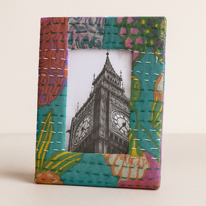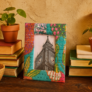 Add a splash of color and culture to your space with thisTurquoise Kantha Fabric Photo Frame. Made from upcycled cotton fabric and stitched in the traditional Kantha style, this frame is perfect for displaying your favorite 4x6 photo on a desk, shelf, or bedside table.