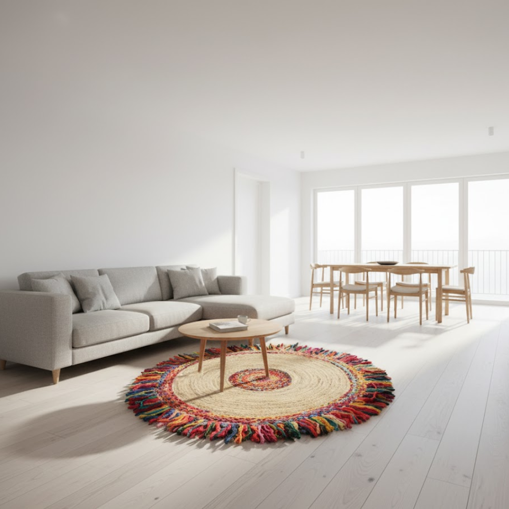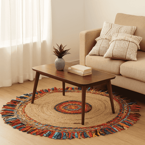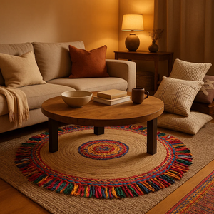 Braided by Hand, Built to Last Artisans in India braid each rug by hand using leftover cotton and jute fibers. This process reduces waste and gives new life to beautiful materials. The round shape and subtle color variations make every rug unique. It’s strong, flexible, and easy to style in any room.