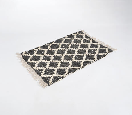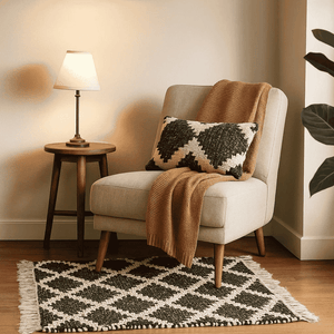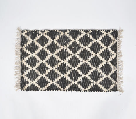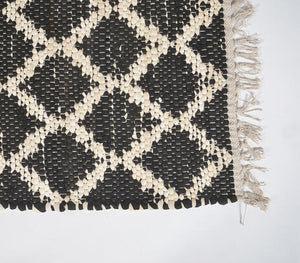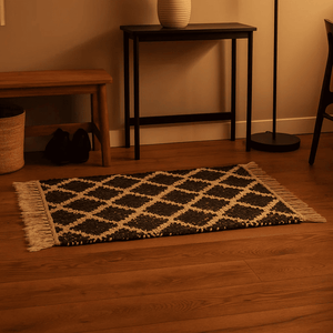 A cotton rug that weaves rhythm into your space. Add depth, movement, and artisan soul to your floors with ourHandwoven Lattice Monochrome Tasseled Rug. Crafted by skilled craftspeople in North India, this rug features a rhythmic lattice pattern in a timeless monochrome palette—perfect for grounding modern, coastal, or minimalist interiors.