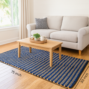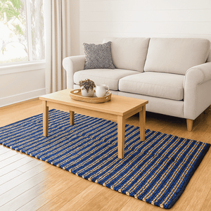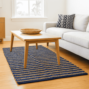 Texture meets tone in thisblue striped rug, handwoven on a wooden loom by skilled artisans in North India. Crafted from a blend of jute, cotton, and polyester, it features clean blue and white stripes that bring calm and rhythm to any room.