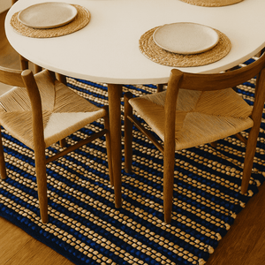 Whether you're styling a coastal living space or layering textures in a minimalist home, thisstriped rugblue adds warmth, structure, and a touch of handcrafted charm. Each piece takes days — sometimes weeks — to complete, making it a true celebration of slow design.