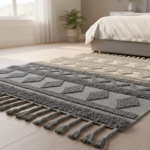 ✨ Add artisanal charm and timeless elegance to your interiors with thisTufted Ash Grey Tasseled Rug — a handcrafted piece that blends tradition with modern design.