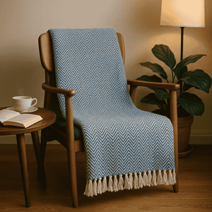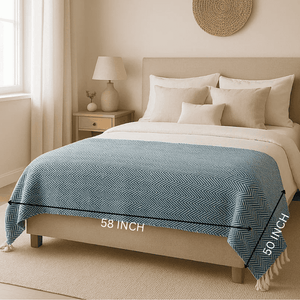 Need a cozy layer that looks as good as it feels? ThisSteel Blue Chevron Cotton Throw is your go-to for effortless style and everyday comfort. Handwoven by skilled artisans in North India, it features a bold chevron pattern in calming steel blue tones, finished with soft tassels that add a playful touch.