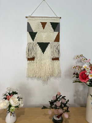 Texture That Tells a Story Thisfringe wall hanging is handwoven and tufted by skilled artisans in North India. It features a mix of loops, lines, and fringe tassels in soft multicolor tones. The geometric design adds structure, while the textures bring warmth and movement to any wall.