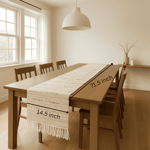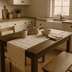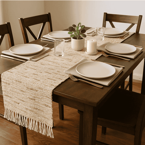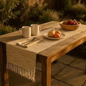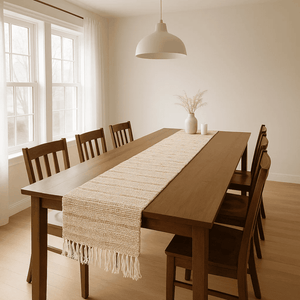 A cotton table runner that weaves warmth into every meal. Elevate your dining experience with ourEarthy Textured Cotton Table Runner, handwoven on traditional wooden looms by skilled artisans in North India. This runnerisn’t just a table accent—it’s a celebration of rhythm, patience, and human touch. Each piece takes days (sometimes weeks!) to complete, with every thread placed intentionally to create a rich, tactile finish.