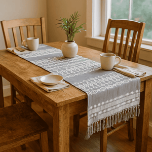 A table runner that threads tradition into modern dining. Add rhythm, texture, and handcrafted charm to your table with ourEmbroidered Tasseled Cotton Table Runner—a tactile piece made from natural cotton and finished with delicate embroidery and soft tassels. Designed for Australian homes that value warmth and story, this runner brings quiet elegance to everyday meals and festive gatherings alike.