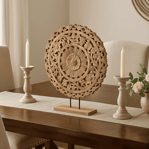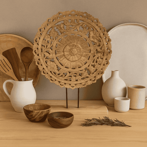 Each piece is carved and cut by hand using simple lathes and sharp tools, making every detail feel intentional and unique. The raw wood surface features natural blemishes, knot holes, and grain variations that give it a lived-in, soulful charm. It’s not just decor—it’s a quiet statement of craftsmanship.