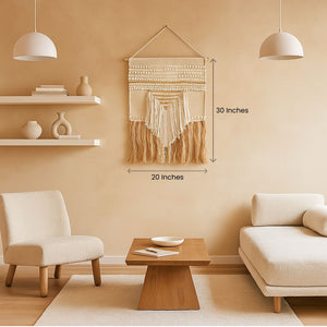 Each piece is woven by artisans using cotton, jute, wool, and wood, giving it a rich, tactile quality that feels alive in any room. The neutral palette makes it versatile, blending seamlessly with coastal, rustic, or minimalist interiors. Whether styled above a bed, in a hallway, or as part of a gallery wall, thisboho wall hanging adds depth and story without overwhelming your space.