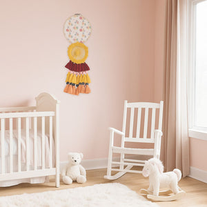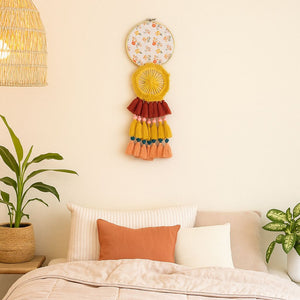 Eachfringe wall hanging is crafted by skilled artisans in India using traditional techniques and slow-crafted care. The chunky tassels and layered textures create movement and depth, while the floral centrepiece adds a soft, feminine touch. Whether styled in a nursery, bedroom, or hallway, this piece brings handcrafted charm to your everyday rituals.