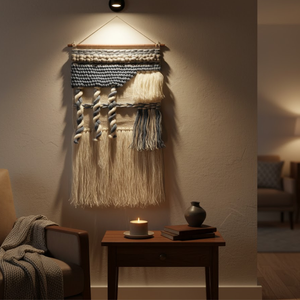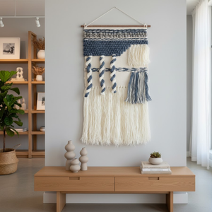 dd texture, warmth, and artistry to your interiors with thishandwoven tufted abstract fringed wall hanging. Crafted by skilled artisans in North India, thiswool wall hanging is made using traditional handweaving techniques on wooden looms, a process that requires rhythm, patience, and precision.