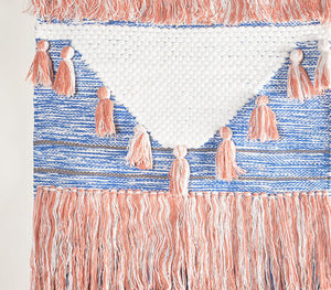 Crafted with rhythm and coastal calm, thiscotton wall hanging brings texture, movement, and artisan soul to your space. Handwoven on a wooden loom by skilled North Indian artisans, it features layered fringe, intricate knots, and a soothing multicoloured palette inspired by Mediterranean landscapes. Every threadis placed with care — often judged by bare feet — making this piece a true celebration of slow craft.