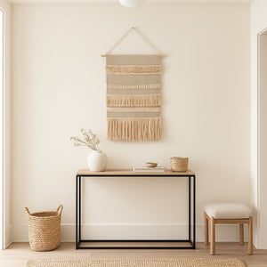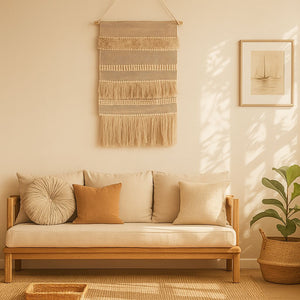 A wall hanging that brings softness, rhythm, and handcrafted soul to your space. Add texture and calm to your walls with ourNeutral Bayadere Striped Wall Hanging—a handwoven piece made from natural cotton and wool, finished with layered fringe and subtle striping. Designed for Australian homes that celebrate slow craft and expressive design, this hanging turns any blank wall into a styled sanctuary.