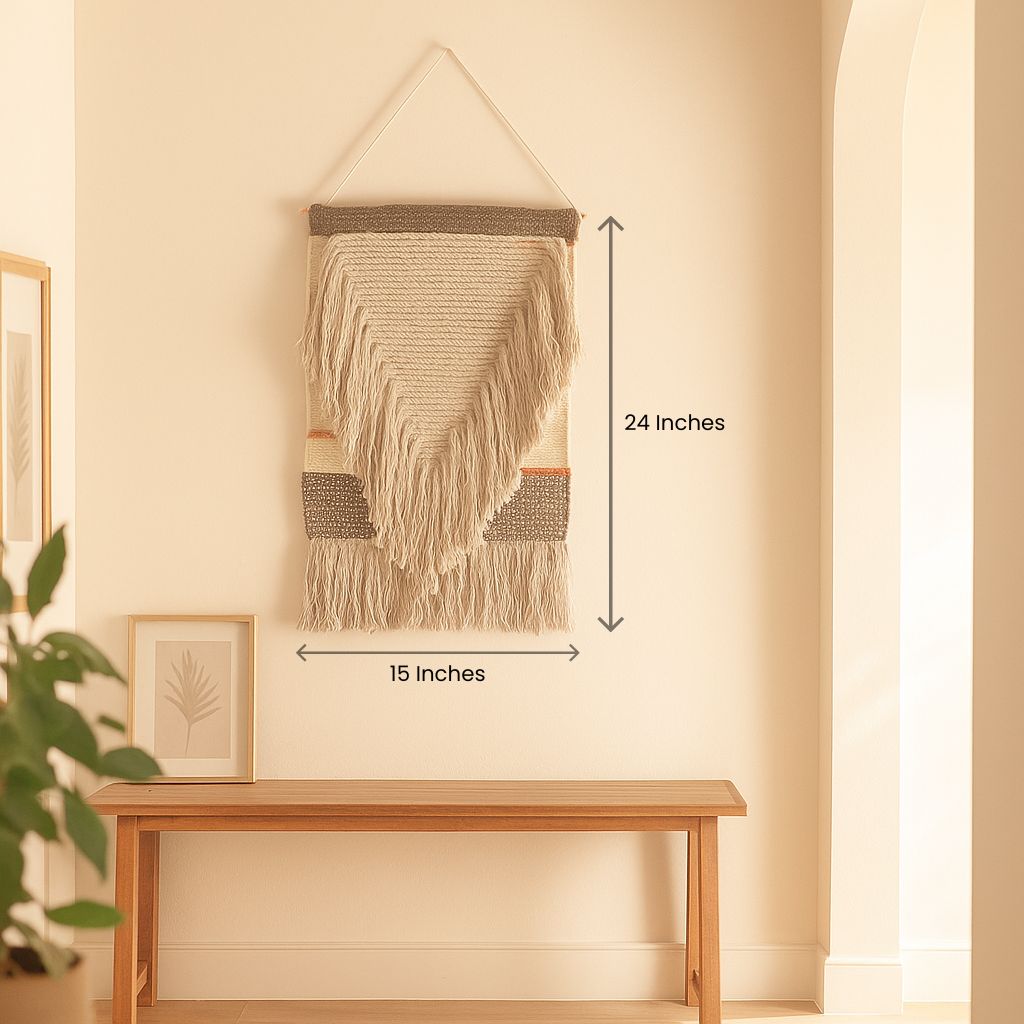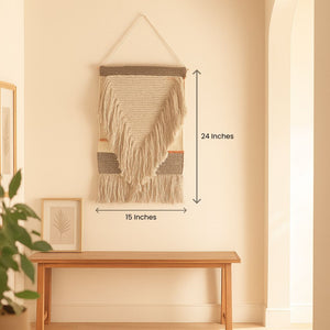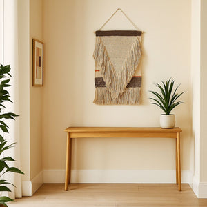 Each piece is woven and tufted by skilled artisans in India using traditional techniques and small-batch care. The neutral palette pairs effortlessly with coastal, rustic, or minimalist interiors, while the cotton-wool blend adds depth and movement. Whether styled above a bed, layered in a hallway, or used as a focal point in a gallery wall, thisboho wall hanging offers a quiet elegance that feels grounded and human.