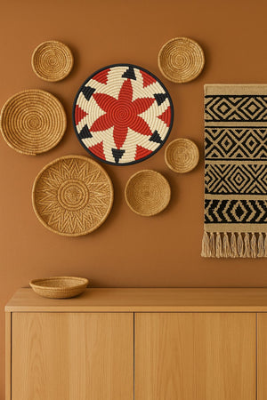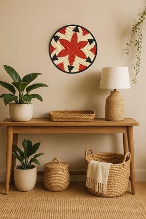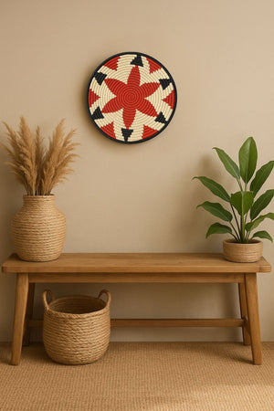 Add texture and symmetry to your space with this handwoven tribal star wall plate. Crafted in natural tones with a bold starburst pattern, this round boho decor piece is ideal for gallery walls, entryways, or living spaces. Lightweight and handcrafted, it blends tradition and modern style effortlessly.