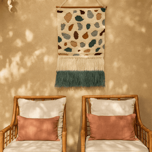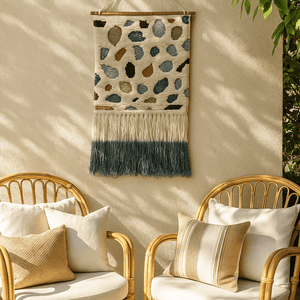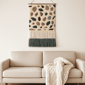 Bold, tactile, and full of movement — thiswool wall hanging is handwoven and tufted by North Indian artisans using traditional techniques. Inspired by terrazzo textures, it features layered loops, abstract shapes, and soft fringe tassels that bring depth and personality to any space.