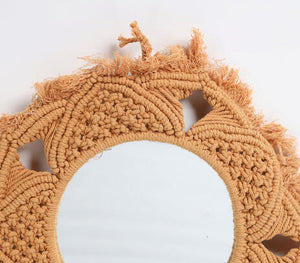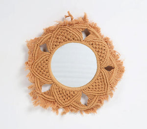 Presenting its nostalgic bohemian line of handmade and homely decor, Gleemium brings to you, this macrame hanging mirror handcrafted with manually designed knots by local Indian artisans. The creation process is relaxed and unhurried as compared to machine-made parallels. Featuring intruguing textures, the offering flaunts class, making it an exciting choice for contemporary living spaces