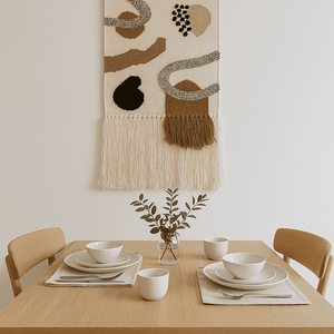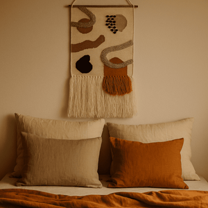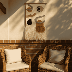 Bold, tactile, and full of character — thisfringe wall hanging is handwoven from soft wool and finished with layered tassels that add movement and depth. Its abstract pattern and neutral tones make it a versatile piece for bedrooms, hallways, or living rooms that crave a little texture.