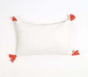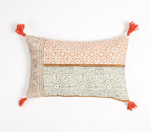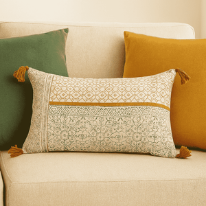 Add Softness and Style to Your Sofa This lumbar cotton cushion cover blends ancient block printing with modern design. Made from soft cotton and printed by hand, it features a geometric-floral pattern in soothing colors. Tassels on the edges add movement and charm, making it a standout piece for your sofa, chair, or bed.