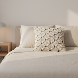 Add artisanal elegance to your interiors with thisbohemian macrame cushion cover, a handcrafted piece that blendstimeless knotting techniques with modern boho style.