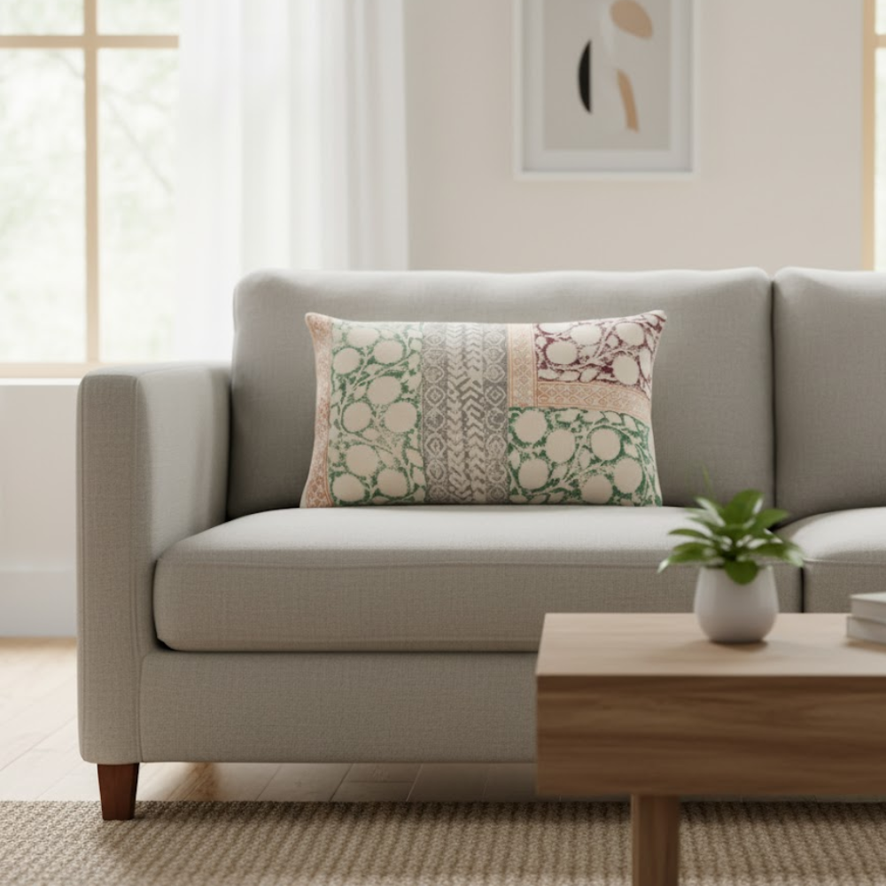Block Printed Cotton Geometric Botanical Lumbar Cushion Cover – Handcrafted Cotton Cushion Cover with Embroidery