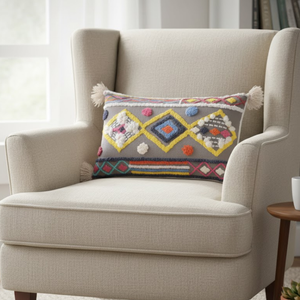 Tailored with love, thisdiamond embroidered eclectic tasseled lumbar cushion cover is ahandcrafted cotton cushion cover that blendsartisanal embroidery withmodern eclectic style.