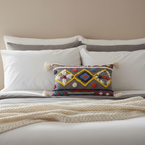 ✨ Add artisanal flair and eclectic charm to your interiors with thisdiamond embroidered tasseled lumbar cotton cushion cover — a handcrafted piece that blends tradition, artistry, and modern design.