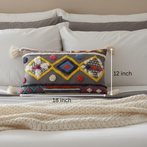 Made from100% cotton, it featuresdiamond embroidery in a vibrant multicolor palette, accented withplayful tassels that add movement and charm. Itslumbar shape makes it perfect forback support on sofas, chairs, or beds, while theconcealed zipper closure ensures a neat finish and easy use.