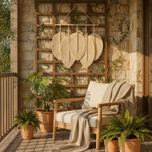 Bringorganic texture and bohemian elegance to your interiors with thisfeathered macrame leaf wall hanging,a handcrafted piece made from100% cotton. Designed insoft beige tones, it featuresintricately knotted leaf-like shapes that create a sense of movement and natural charm.