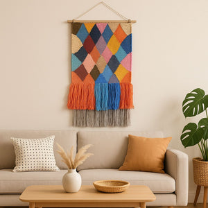 Add bold contrast and texture to your walls with this handcrafted geometric fringed wall hanging. Featuring abstract diamond shapes and soft fringe detail in natural tones, this cotton textile décor piece fits effortlessly into boho, tribal, or contemporary interiors. Hang it in your living space, hallway, or creative corner for a grounding yet stylish focal point.