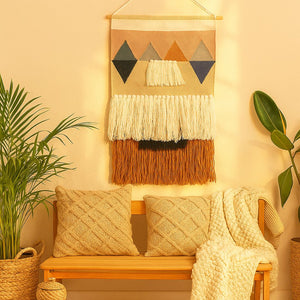 The geometric pattern and calming gold tones make it a standoutboho wall hanging for bedrooms, hallways, or creative corners. Whether you're curating a gallery wall or seekingwall hanging decor that feels earthy and intentional, this piece brings warmth and story to your home.