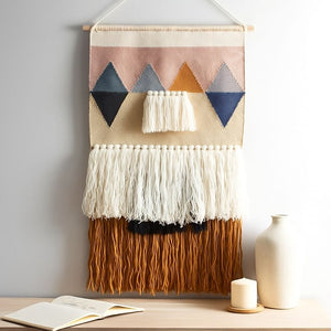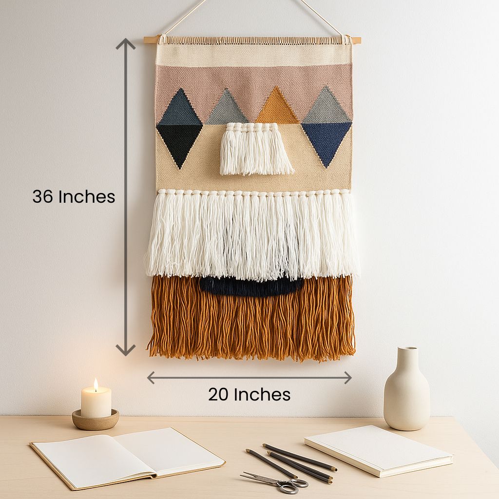 A woolen wall hanging that blends texture, rhythm, and artisan soul. Add depth and movement to your space with ourHandwoven & Tufted Geometric Fringed Wall Hanging—a high-visual piece designed to elevate any blank wall. Crafted by skilled artisans in North India, this hanging features a complex interplay of loops, tufted textures, and fringe tassels, all woven by hand using traditional wooden looms.