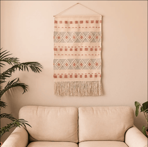 Earthy Tones, Modern Lines This wall hanging blends geometric design with warm terra tones to create a bold yet calming statement. Handwoven from wool and cotton, it’s perfect for adding texture and depth to any decor hanging wall.