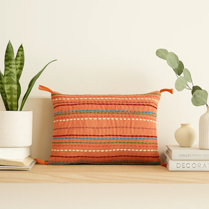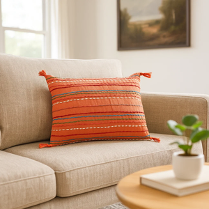 Add a touch of artisanal elegance to your interiors with thisstriped & tasseled slub coral lumbar cotton cushion cover, a handcrafted piece that blendscomfort, texture, and decorative flair.
